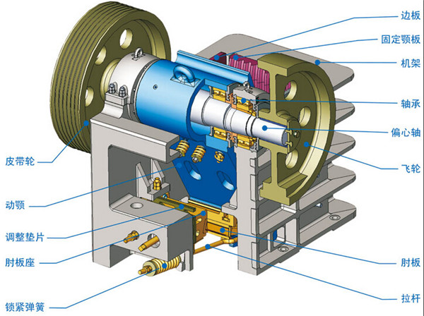 鄂式破碎机的工作方式为曲动挤压型,电动机驱动皮带和皮带轮,通过偏心轴使动颚上下运动,当动颚上升时肘板与动颚间夹角变大,从而推动动颚板向固定颚板接近,与其同时物料被压碎或劈碎,达到破碎的目的;当动颚下行时,肘板与动颚夹角变小,动颚板在拉杆,弹簧的作用下,离开固定颚板,此时已破碎物料从破碎腔下口排出。随着电动机连续转动而破碎机动颚作周期运动压碎和排泄物料,实现连续生产。